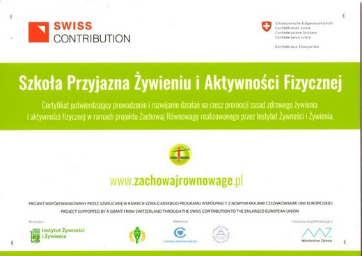 Certyfikat Szkoła Przyjazna Żywieniu i Aktywności Fizycznej